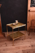フランスで買い付けたガラストップサイドテーブル。ブラスの色合いと装飾が上品な印象を与えてくれ、色のついたガラスの天板がさらに雰囲気を高めてくれています。程よい装飾が入ったスクエアのデザインが良く、程よいサイズ感はソファ前はもちろん、サイドテーブルなどとして様々な場所や用途で使えそうです。年代特有の汚れ、傷、色褪せ、小さな欠けなどがございますが、風合いとしてお楽しみください。