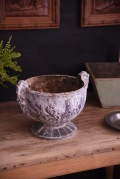 フランスで買い付けたアイアンプランター。年月を経て風合いが増したペイントや錆の表情が魅力的。丸みを帯びたフォルムが可愛らしさを引き立てつつ、アイアンならではの重厚感もあり、存在感があります。小ぶりな植物の鉢カバーなどとしても使え、玄関先はもちろん、室内外様々な場所や用途で活躍してくれそうです。古い物ですので、汚れ、擦り傷、錆、ペイント剥げ等ございますが、風合いとしてお楽しみ頂ければと思います。 サイズ:横/約36.5cm, 奥行き/約30cm, 高さ/約26.5cm, 口径/約26cm 送料ランク:F