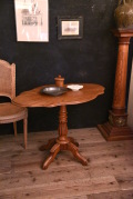 フランスで買い付けたティルトップテーブル。上品な木肌やフォルム、程よい装飾などは独特な雰囲気を与えてくれています。程よいサイズ感はちょっとしたダイニングテーブル、飾り台、サイドテーブルなど様々な用途や場所で使え、空間の雰囲気づくりや店舗什器としてもおすすめです。天板を立てて収納できるのも良いです。年代特有の汚れ、傷、色褪せ、多少の歪みなどがありますが、古い物ならではの風合いとしてお楽しみください。