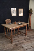 フランスで買い付けた木製テーブル。明るい天板の風合いが良く、年月を経た色合いの程よい脚の装飾などが存在感を引き立ててくれています。シンプルなデザインは空間に合わせやすく、程よいサイズ感はダイニングテーブルやデスクなど様々な用途でご使いになれます。年代特有の汚れ、傷、擦り傷、色褪せ、補修跡、虫喰い跡などがございますが、古い物の風合いとしてお楽しみください。