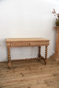 フランスで買い付けたドロワーテーブル。年月を経たことが伺える明るい色味の天板の表情が良く、脚のデザインや施された装飾が美しく、雰囲気を引き立ててくれています。引き出しもついており、明るい色味は様々なテイストの家具とも合わせやすいので、空間の雰囲気を引き立ててくれそうです。デスクや作業台、店舗什器などとしてもオススメです。引き出しに鍵がついており、取っ手としてお使いください。また脚にはローラーもついており、移動の際に便利ですが、床材によっては傷がつく可能性がございますので、持ち上げての移動をおすすめします。年代特有の汚れ、傷、色褪せ、シミ、補修跡、歪み、反り、虫喰い跡、隙間などがありますが、古い物ならではの風合いとしてお楽しみください。