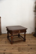 フランスで買い付けたコーヒーテーブル。年月を経た濃い木の色味が良く、四角い凝ったデザインのフォルムは存在感を与えてくれています。引き出しも一つ付いており、引き出しの装飾も程良いアクセントになっており、ソファ前に置いたり、飾り台など様々な用途や場所で使え、空間の雰囲気づくりや店舗什器としてもおすすめです。年代特有の汚れ、傷、色褪せ、歪み、シミ、塗装剥げなどがありますが、古い物ならではの風合いとしてお楽しみください。