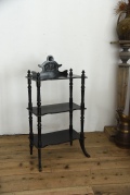 フランスで買い付けたミュージックシェルフ。楽譜を収納するために作られた家具で、ブラックのペイントや支柱のデザインはナポレオン3世様式の上品な雰囲気を漂わせています。雑貨やアクセサリーなどを飾ったり、本を収納してもよろしいかと思います。重さも、女性一人で持ち上げられる程度なので、移動も簡単に行えます。年代特有の汚れ、傷、塗装はげ、歪み、補修跡などがございますが、古い物の風合いとしてご理解頂ければと思います。