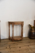 フランスで買い付けた半円の天板や脚のデザインが良い木製のサイドテーブル。木の風合いが良く、シンプルなデザインは他の家具とも調和しやすく、丸みを帯びたフォルムや脚の装飾はベッドサイドや花台など様々な場所や用途でご使用頂けます。年代特有の傷、汚れ、色褪せ、歪み、反りなどがございますが、風合いとしてお楽しみください。 サイズ:横/約64cm、奥行き/約29.5cm、高さ/約74.5cm 下段:横/約60.5cm、奥行き/約27cm、高さ/約52.8cm 送料ランク:G