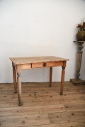 フランスで買い付けたドロワーテーブル。年月を経たことが伺える明るい色味の天板の表情が良く、雰囲気を引き立ててくれています。引き出しもついており、シンプルなフォルムは様々なテイストの家具とも合わせやすいので、空間の雰囲気を引き立ててくれそうです。引き出しの取手が取り替えられています。年代特有の汚れ、傷、色褪せ、隙間、シミ、補修跡、歪み、反りなどがありますが、古い物ならではの風合いとしてお楽しみください。