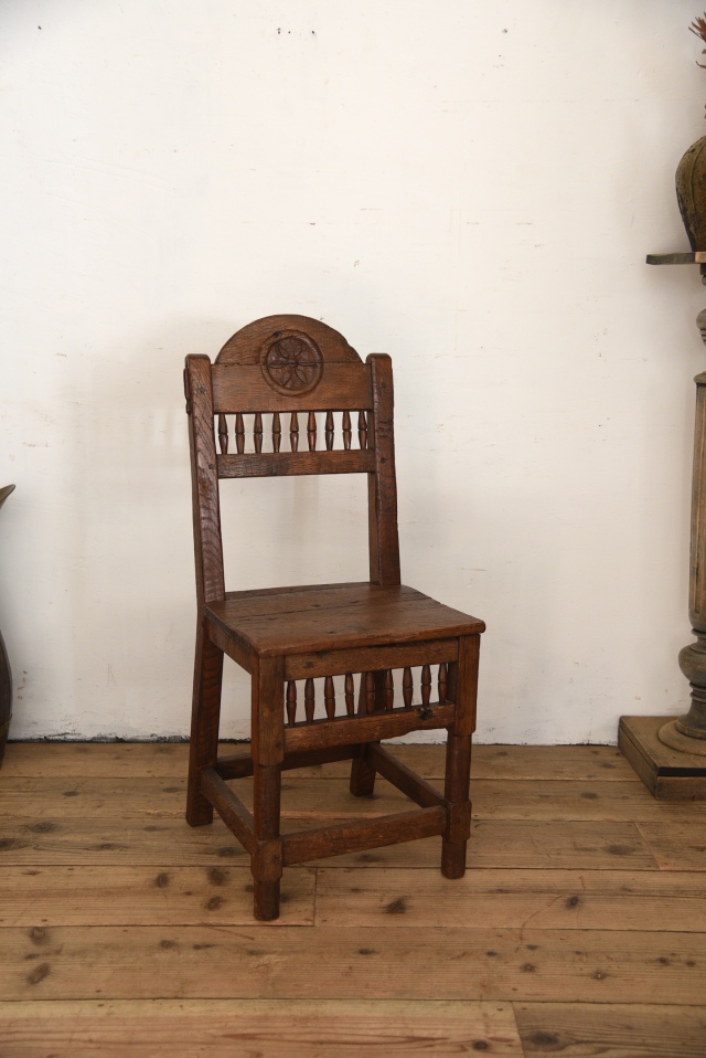 フランスで買い付けた古いチェア。長い間使用されてきて素朴ながら深みがあります。脚と背もたれの装飾や彫りが施されていて個性的です。ずっしりとした重みがあり、年月を経た木の風合いは空間作りにおすすめで、飾り椅子や店舗什器としてのご使用もよろしいかと思います。年代特有の汚れ、擦り傷、多少の歪み、割れ、欠け、補修跡、虫喰い跡などはございますが、古い物の風合いとしてお楽しみください。