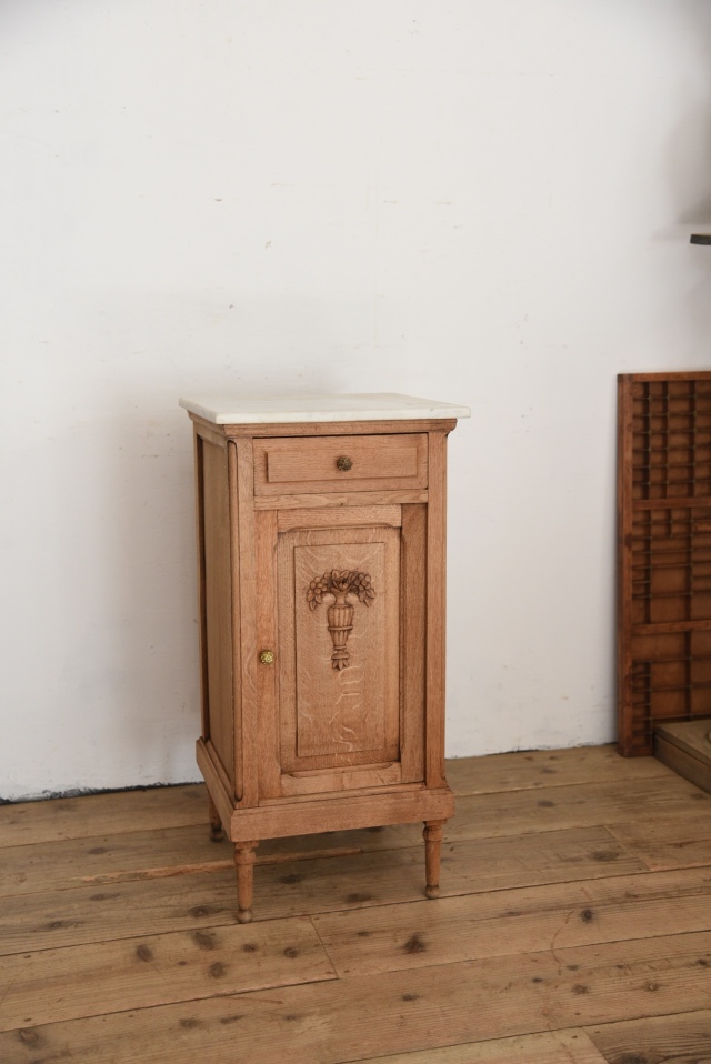 フランスで買い付けたベッドサイドテーブル。程よい装飾が上品な印象を与えてくれ、天板の風合いも良く、ドロワーと収納スペースがあり、ちょっとした収納に便利で様々な場所や用途、空間作りなどにもオススメです。天板は上にのせているだけで、固定はされていないものになります。年代特有の汚れ、傷、色褪せ、小さな欠け、シミなどがございますが、古い物の風合いとしてお楽しみください。