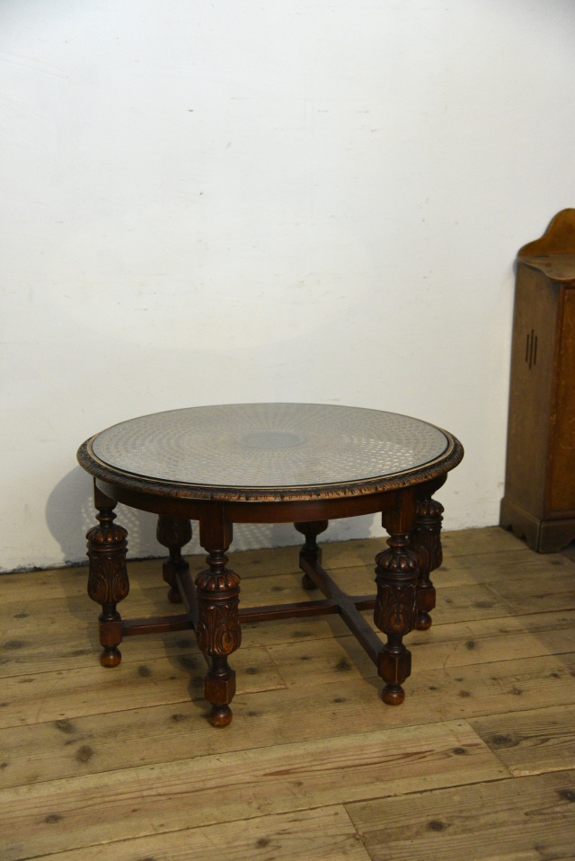 フランスで買い付けたガラストップテーブル。落ち着いた色味の木肌が良く、細かな装飾の脚が存在感を高めてくれています。ガラスの下の籐張りがアクセントになっており、ソファ前に置いたり、飾り台など様々な用途や場所で使え、空間の雰囲気づくりや店舗什器としてもおすすめです。年代特有の汚れ、傷、色褪せ、歪み、欠け、擦り傷などがありますが、古い物ならではの風合いとしてお楽しみください。