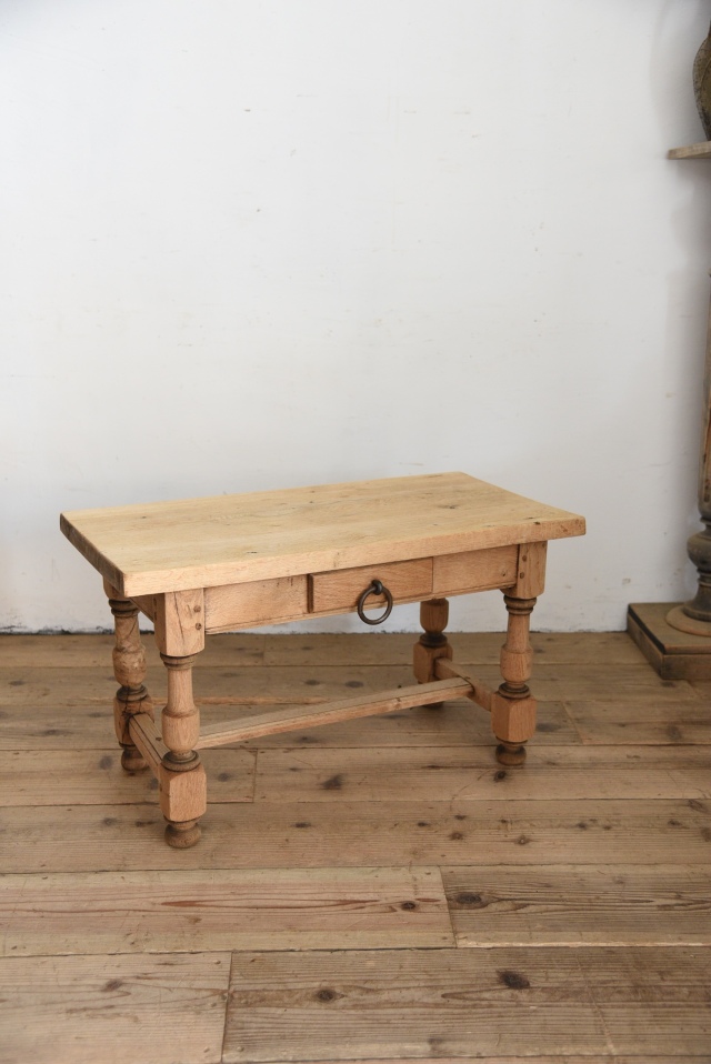 フランスで買い付けたコーヒーテーブル。明るめの落ち着いた色味の木肌が良く、使いやすいシンプルな長方形のデザインは安定感を与えてくれています。引き出しも付いており、ちょっとした収納にも便利で、ソファ前に置いたり、飾り台など様々な用途や場所で使え、空間の雰囲気づくりや店舗什器としてもおすすめです。年代特有の汚れ、傷、色褪せなどがありますが、古い物ならではの風合いとしてお楽しみください。