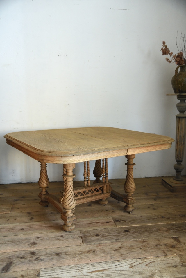 フランスで買い付けたアンリ2世のテーブル。年月を経たことが伺える明るい色味の表情が良く、雰囲気を引き立ててくれています。脚の装飾が美しく、四角いフォルムはディスプレイ台などとして、空間の雰囲気を引き立ててくれそうです。飾り台やデスク、店舗什器などとしてもオススメです。足先にキャスターが付いていますが、動作が少し硬くなっており、古いものですので、持ち運びの際は少し持ち上げて移動することをお勧めします。年代特有の汚れ、傷、色褪せ、シミ、歪み、反り、欠けなどがありますが、古い物ならではの風合いとしてお楽しみください。