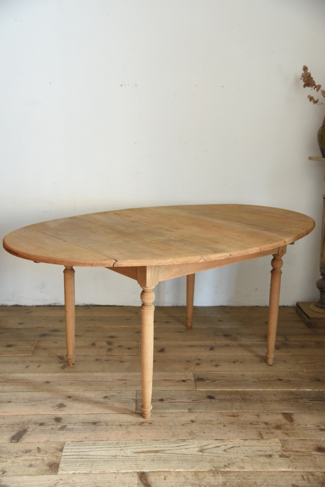 フランスで買い付けたドロップリーフテーブル。色褪せた天板の風合いが良く、左右の天板を折りたたみでき、サイズ調整可能で、綺麗な脚の装飾などが存在感を引き立ててくれています。オーバルのデザインが特徴的で、程よいサイズ感は飾り台やコンソール、店舗什器など様々な用途でご使いになれます。年代特有の汚れ、傷、擦り傷、色褪せ、歪みなどがございますが、古い物の風合いとしてお楽しみください。