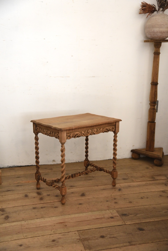 フランスで買い付けたサイドテーブル。明るい木の風合いは他の家具とも調和しやすく、天板や程よく施された装飾は上品な印象を与えてくれます。、コーヒーテーブル、ベッドサイドや花台など様々な場所や用途でご使用頂けます。年代特有の傷、汚れ、色褪せ、シミ、歪み、補修跡等がございますが、風合いとしてお楽しみください。