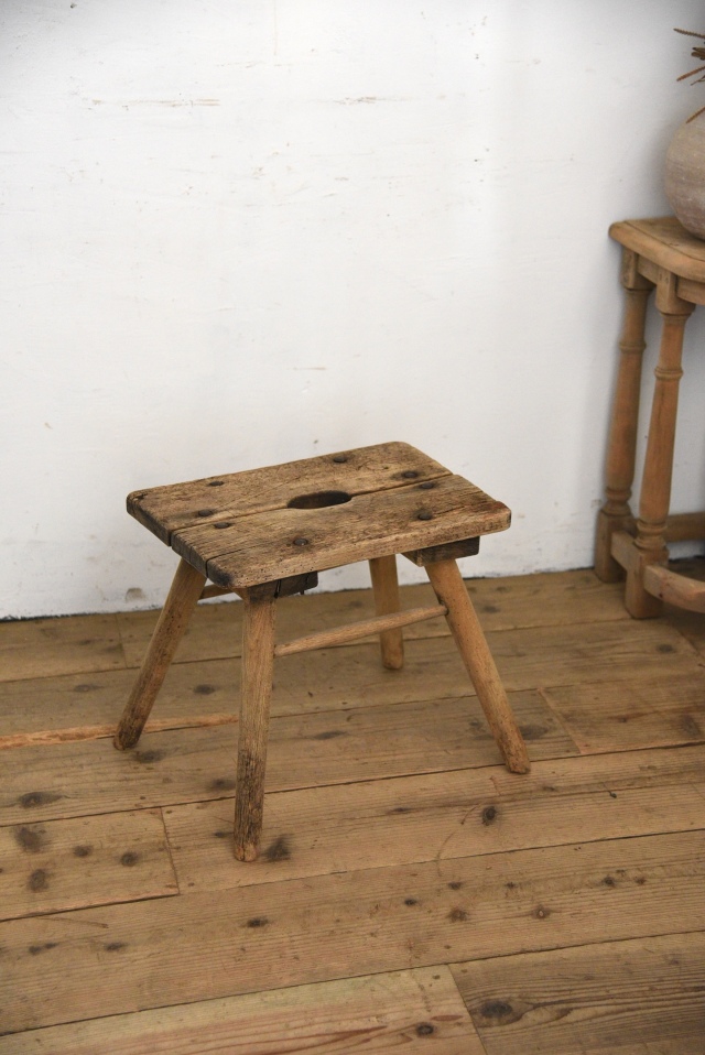 フランスで買い付けたスツール。長い年月を経たことがうかがえる木の風合いは独特な雰囲気があり、ナチュラルなテイストは色々なシーンに馴染み日常使いはもちろん、お花や植物などと一緒に飾るのにも良さそうです。置いておくだけで空間の雰囲気をぐっと引き立ててくれそうです。年代特有の汚れ、傷、色褪せ、シミ、虫食い跡などがございますが、古い物の持ち味としてお楽しみ頂ければと思います。